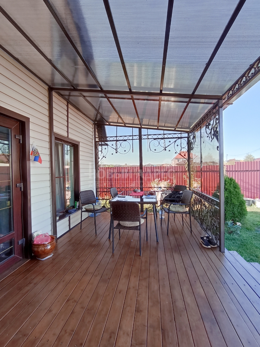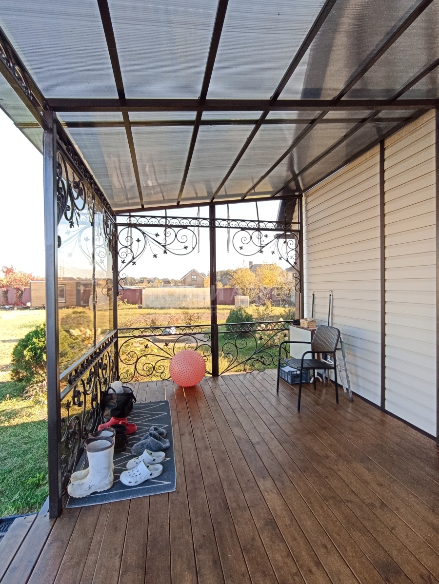 Ко входу в дом примыкает каркасная металлическая веранда с мягкими открывающимися окнами с тонировкой и крышей из поликарбоната - прекрасное место для отдыха и чаепития