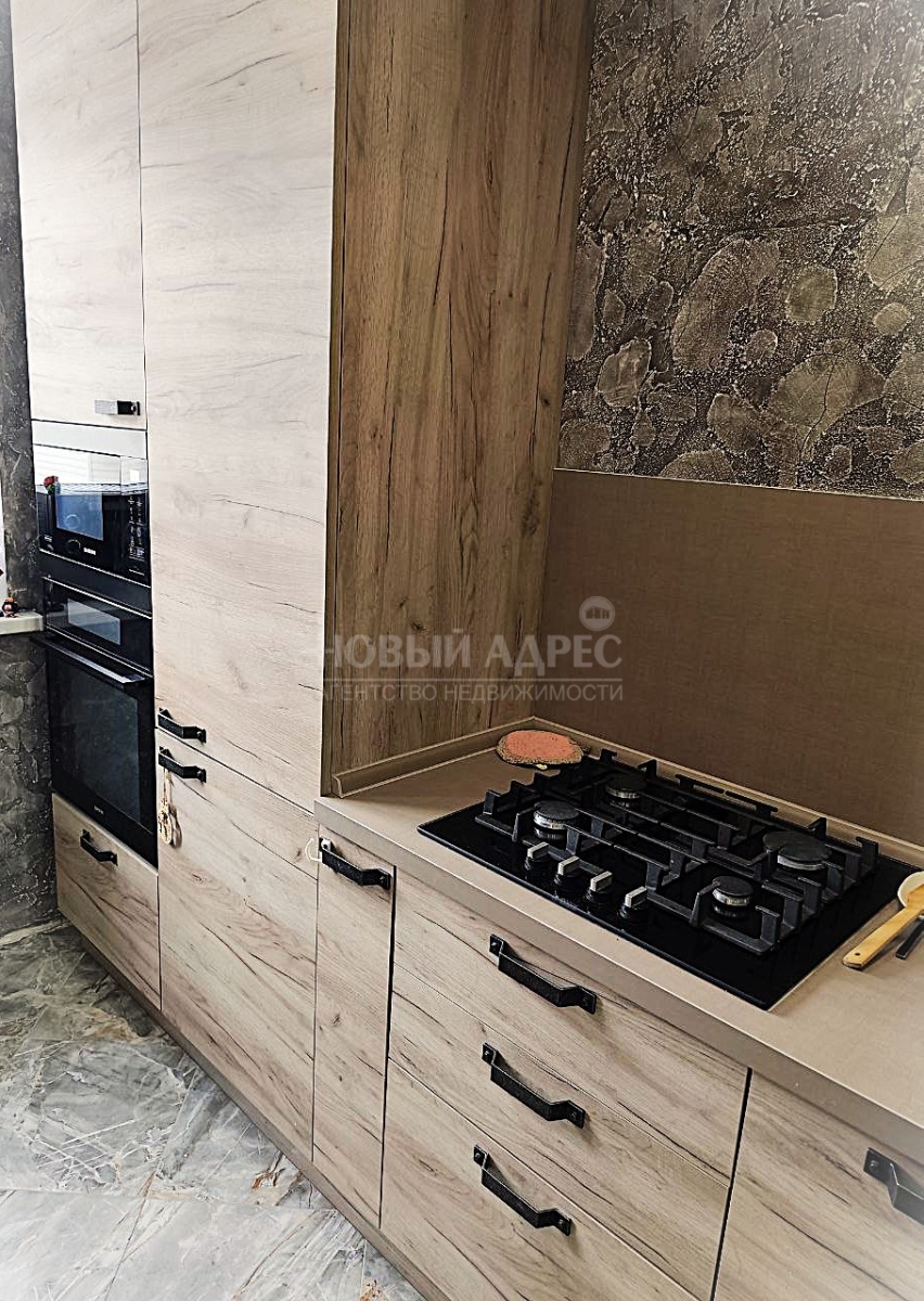 Также имеется новый кухонный гарнитур из натуральной древесины ясеня с интегрированной бытовой техникой.