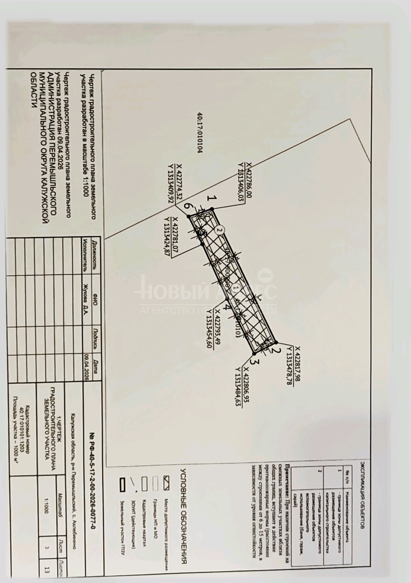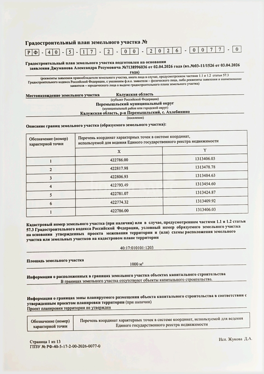 ГРАДОСТРОИТЕЛЬНЫЙ ПЛАН (получен 03 апреля 2026 году). Площадь 1000 кв.м. 10 соток. УЧАСТОК РАСПОЛОЖЕН в территориальной зоне Ж 1 ЗОНА ЗАСТРОЙКИ МАЛОЭТАЖНЫМИ ЖИЛЫМИ ДОМАМИ.